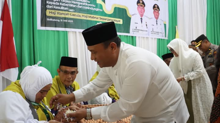 Dairi – Pancapena.com – Pemerintah Kabupaten Dairi Melaksanakan acara Tepung Tawar sekaligus Pemberangkatan secara Simbolis Kepada 21 Orang Jemaah Calon Haji. Kamis, (15/05/2025) di Gedung Balai Budaya, Jalan Sisingamangaraja, Kecamatan Sidikalang, Kabupaten Dairi, Provinsi Sumatera Utara, Indonesia.