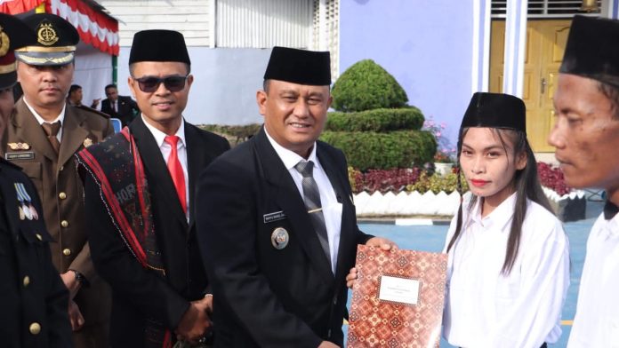 Dairi – Pancapena.com – Wakil Bupati Dairi, Wahyu Daniel Sagala Menyerahkan Remisi Umum dan Dasawarsa Kepada Warga Binaan Rutan Kelas IIB Sidikalang pada, Upacara Dalam Rangka Menyambut Hari Ulang Tahun Kemerdekaan Republik Indonesia (HUT RI) yang Ke-80 Tahun 2025. Minggu, (17/08/2025) di Jalan Rimo Bunga, Kecamatan Sitinjo, Kabupaten Dairi, Provinsi Sumatera Utara, Indonesia.