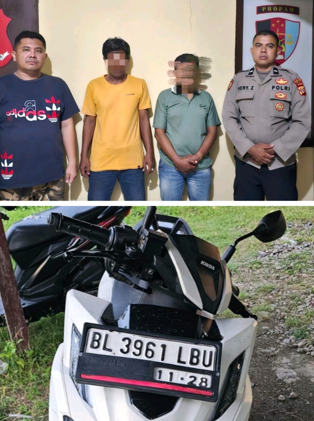 PIDIE JAYA –Pancapena.com Personel Polsek Bandar Dua di bawah jajaran Polres Pidie Jaya berhasil mengamankan dua pelaku tindak pidana penggelapan sepeda motor yang diketahui membawa kendaraan hasil kejahatan dari wilayah hukum Polresta Banda Aceh ke Kecamatan Bandar Dua, Kabupaten Pidie Jaya.