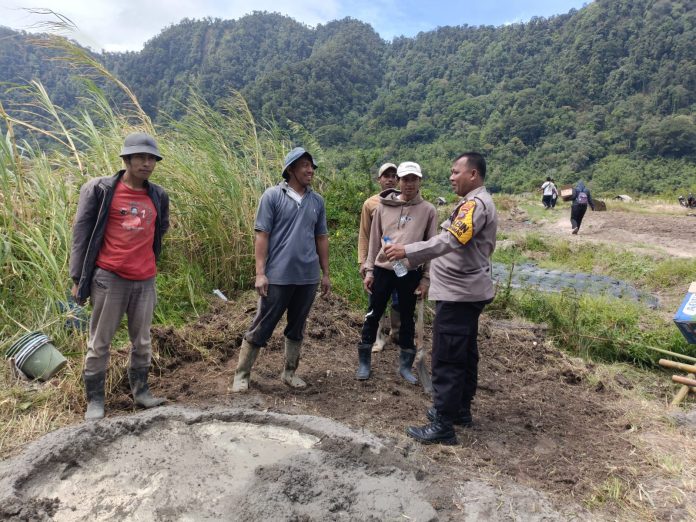 Karo — Pancapena.com – Bhabinkamtibmas Polsek Berastagi, Aipda Dailing Tambunan, menghadiri kegiatan peletakan batu pertama pembangunan pintu air yang dilaksanakan di Sabah Kunjulu, Dusun III, Desa Doulu, Kecamatan Berastagi, Kabupaten Karo, pada Selasa, 15 Juli 2025 sekitar pukul 10.00 WIB.
