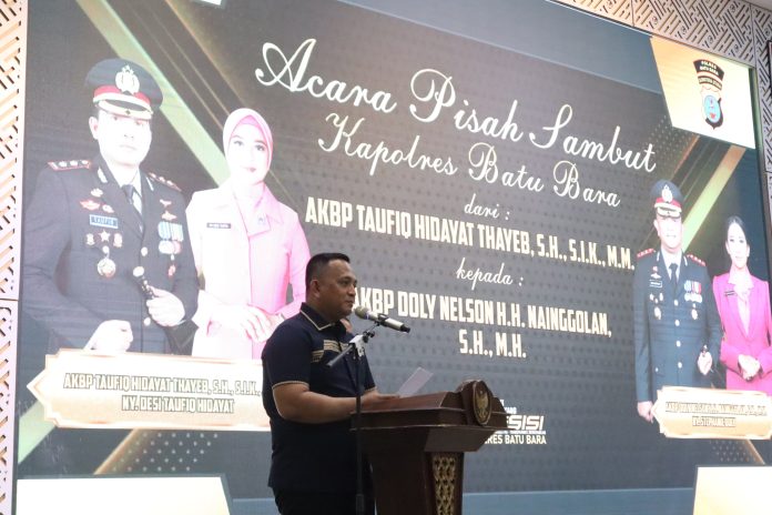 Pancapena.com – Lima Puluh// Malam Pisah Sambut Kapolres Batu Bara Dari AKBP Taufik Hidayat Thayeb, S.H., S.I.K., M.M kepada AKBP Doly Nelson H.H Nainggolan, S.H., M.H di hadiri oleh Forkopimda Plus Kabupaten Batu Bara, Selasa 25 Maret 2025 sekira pukul 17.00 wib di Aula kantor Bupati Batu Bara Provinsi Sumut.