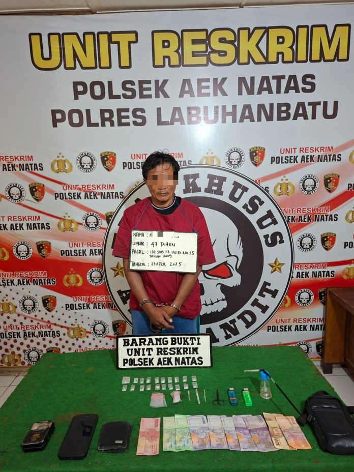 Pancapena.com – Unit Opsnal Polsek Aek Natas, Polres Labuhanbatu berhasil mengungkap kasus penyalahgunaan narkotika jenis sabu di wilayah hukumnya. Seorang pria berinisial AA alias Ayub (47), warga Dusun II Desa Perkebunan Padang Halaban, Kecamatan Aek Kuo, Kabupaten Labuhanbatu Utara, diamankan bersama sejumlah barang bukti pada Rabu (23/4/2025) sekitar pukul 18.20 WIB.