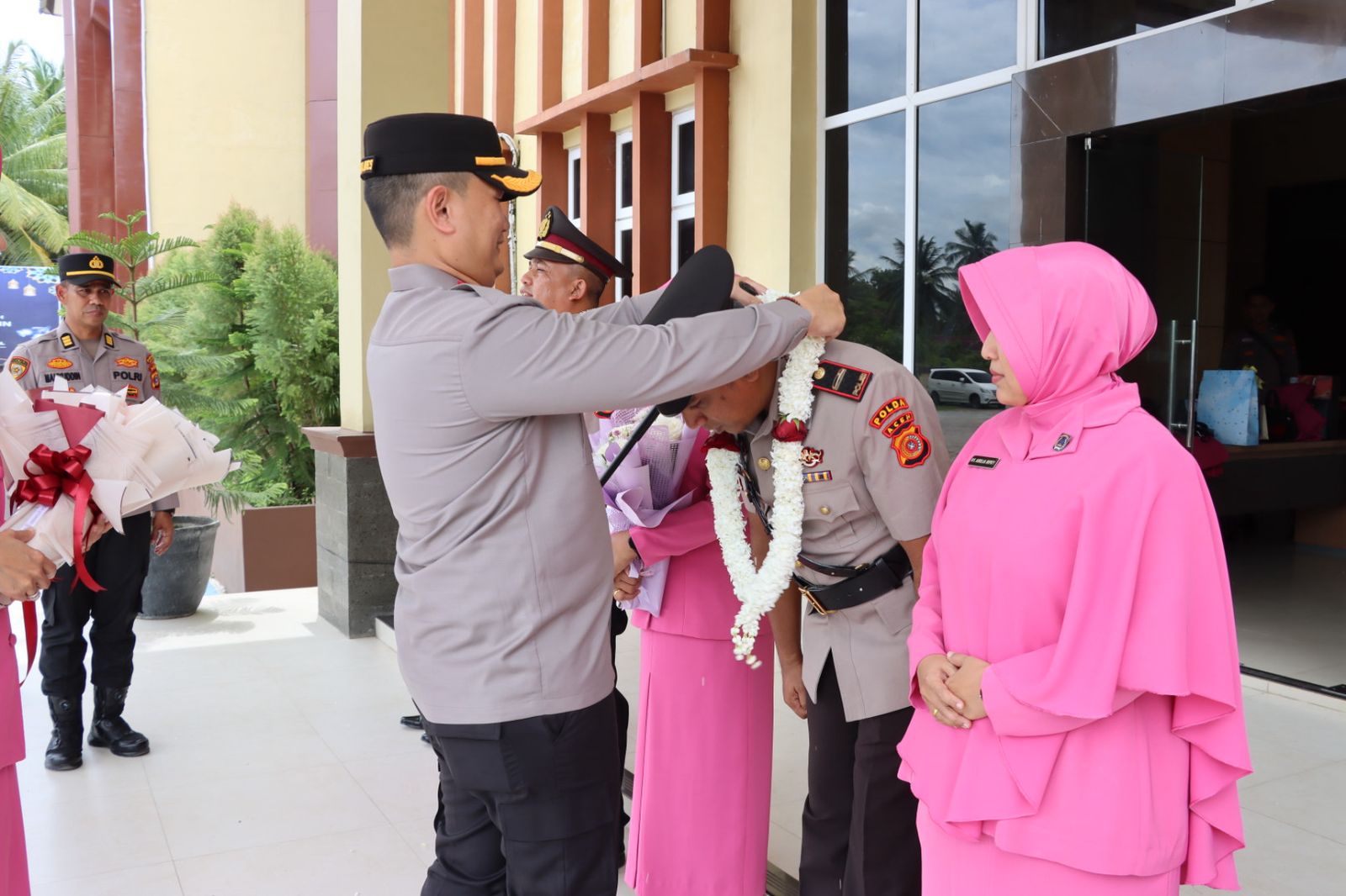 Acara ini juga turut dihadiri oleh Wakapolres yang baru, Kompol Iswahyudi, S.H., CPHR, CBA, serta para pejabat utama Polres, perwira, staf, dan seluruh personel.