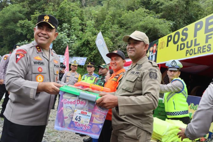 Sebagai bentuk dukungan kepada petugas yang bertugas di lapangan, Kapolda juga menyerahkan bingkisan Lebaran serta peralatan operasional seperti mantel hujan dan alat peraga isyarat lalu lintas.