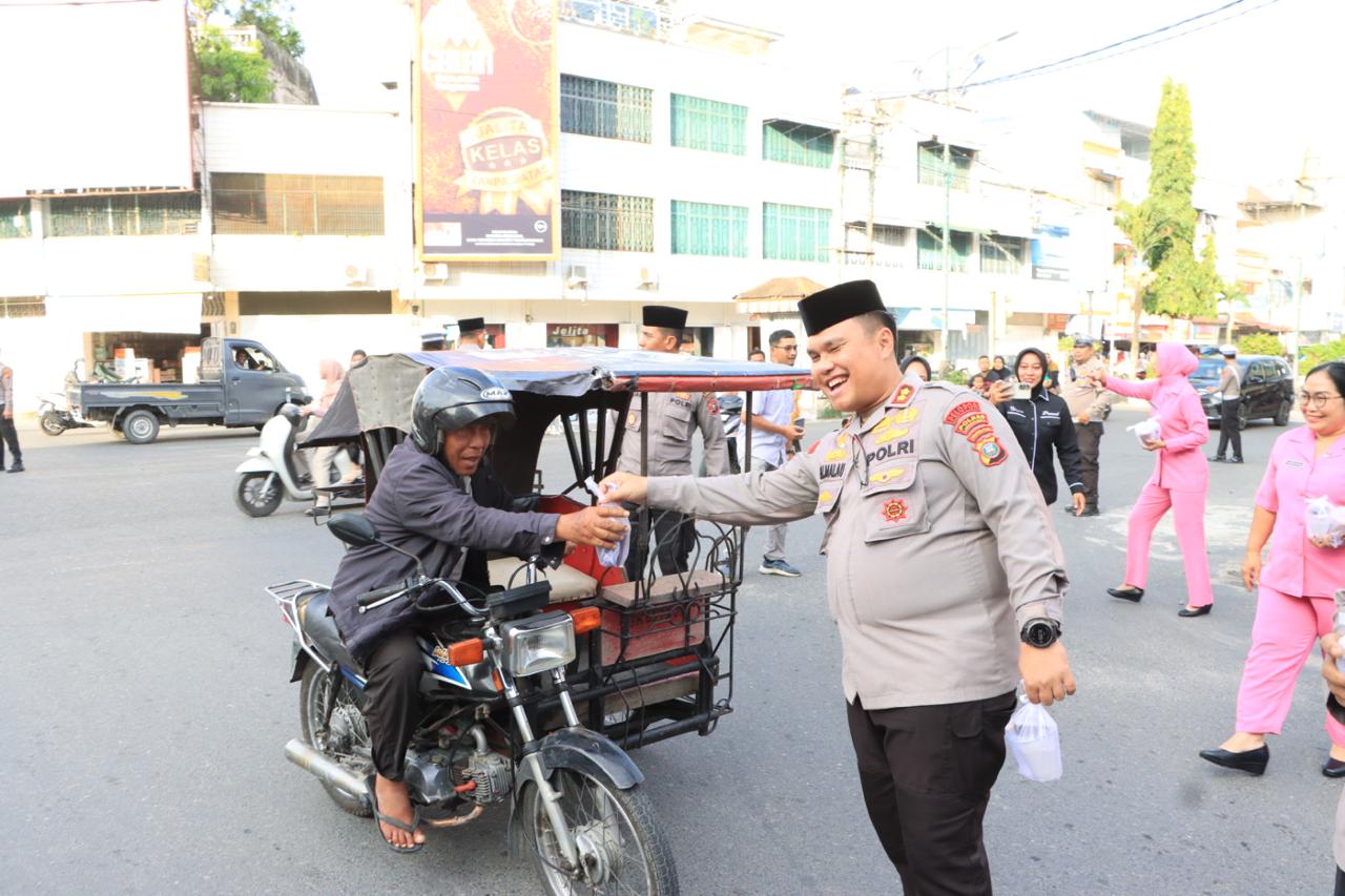 Turut hadir dalam kegiatan ini Wakapolres Labuhanbatu, KOMPOL H. Matondang, S.H., M.H., Ketua Bhayangkari Cabang Labuhanbatu, Ny. Ana Bernhard L. Malau, serta para pejabat utama Polres Labuhanbatu dan anggota Bhayangkari. Dengan penuh kehangatan, mereka membagikan 500 paket takjil kepada pengendara dan masyarakat yang melintas, sebagai bentuk kepedulian terhadap sesama di bulan penuh berkah ini.