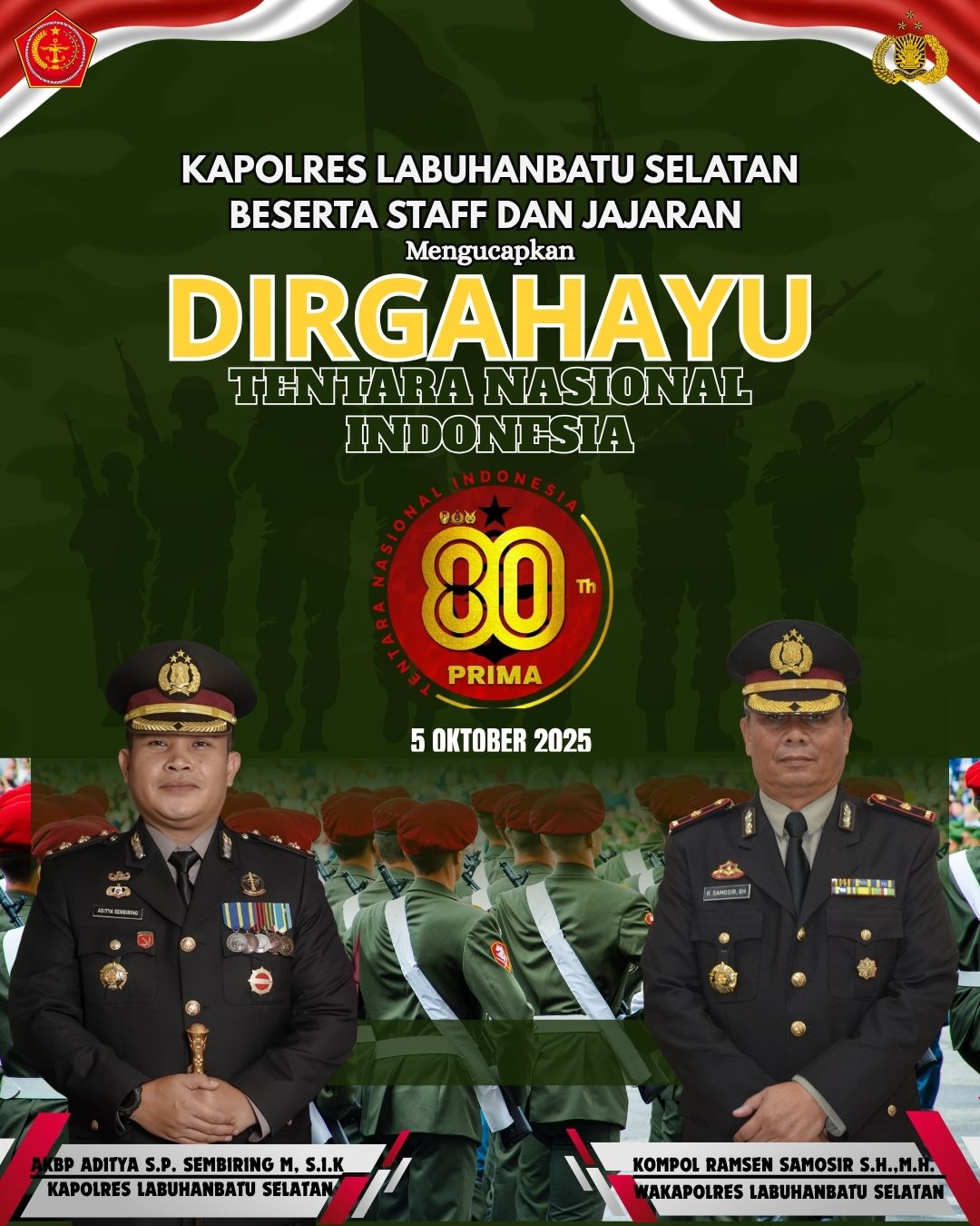Pancapena.com – Labuhanbatu Selatan, 5 Oktober 2025 – Kapolres Labuhanbatu Selatan bersama staf dan jajaran dengan penuh hormat mengucapkan Dirgahayu ke-80 Tentara Nasional Indonesia (TNI) kepada seluruh prajurit TNI di seluruh penjuru tanah air.