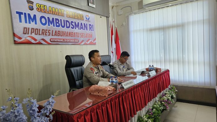 Labuhanbatu Selatan – Pancapena.com – Kapolres Labuhanbatu Selatan, AKBP Aditya S.P. Sembiring Muham, S.I.K., menerima kunjungan kerja Ombudsman Republik Indonesia Perwakilan Sumatera Utara di Aula Polres Labuhanbatu Selatan, Rabu (29/10/2025).