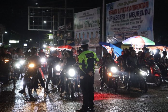 Personel Polres Pidie Jaya bersama Dinas Perhubungan dan Satpol PP turut dikerahkan untuk memastikan kelancaran dan keamanan jalannya pawai takbir keliling yang diikuti oleh masyarakat dari berbagai kecamatan.