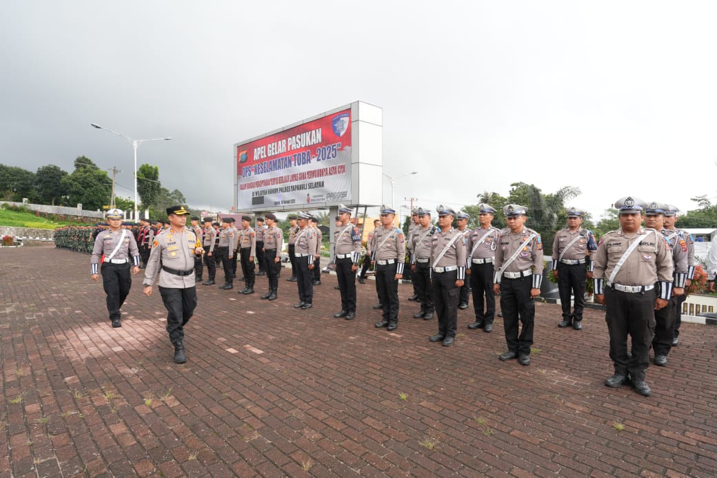 Pancapena.com – Tapanuli Selatan, 10 Januari 2025 – Polres Tapanuli Selatan menggelar Apel Gelar Pasukan Operasi Kepolisian Kewilayahan Keselamatan Toba 2025” di halaman Mako Polres Tapanuli Selatan, Jalan Lafran Pane, Desa Kilang Papan, Kecamatan Sipirok. Kegiatan ini dipimpin langsung oleh Kapolres Tapanuli Selatan AKBP Yasir Ahmadi, S.I.K., M.H. dengan tujuan menciptakan ketertiban berlalu lintas guna mewujudkan Asta Cita di wilayah hukum Polres Tapanuli Selatan.