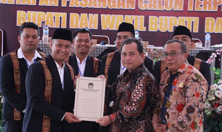 Pancapena.com | Dairi – Komisi Pemilihan Umum (KPU) Kabupaten Dairi secara resmi menetapkan pasangan calon terpilih hasil Pemilihan Bupati dan Wakil Bupati Kabupaten Dairi Tahun 2024. Penetapan ini dilakukan dalam Rapat Pleno Terbuka yang berlangsung di Kantor KPU Dairi, Jalan Pandu, Sidikalang, pada Kamis (8/1/2025).