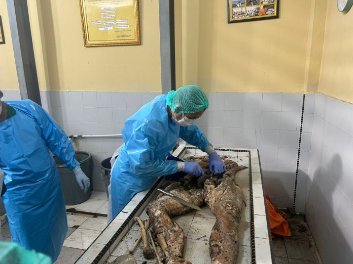 “Dari pemeriksaan awal, kondisi jasad sudah membusuk, tanpa kepala, serta beberapa bagian tubuh tidak lengkap. Jenis kelamin belum bisa dipastikan, namun diperkirakan berusia sekitar 40 tahun dengan tinggi badan sekitar 160 cm,” jelas Iptu Pedoman Maha.