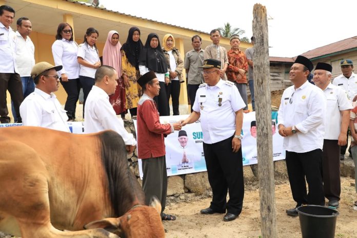 Dairi – Pancapena.com – Bupati Dairi, Ir. Vickner Sinaga, MM bersama Wakil Bupati Dairi, Wahyu Daniel Sagala Menyerahkan Seekor Sapi dari Presiden Republik Indonesia (RI), Prabowo Subianto ke salah satu Masjid. Rabu, (04/06/2025) di Desa Pangaribuan Kecamatan Siempat Nempu Hulu Kabupaten Dairi, Provinsi Sumatera Utara, Indonesia.