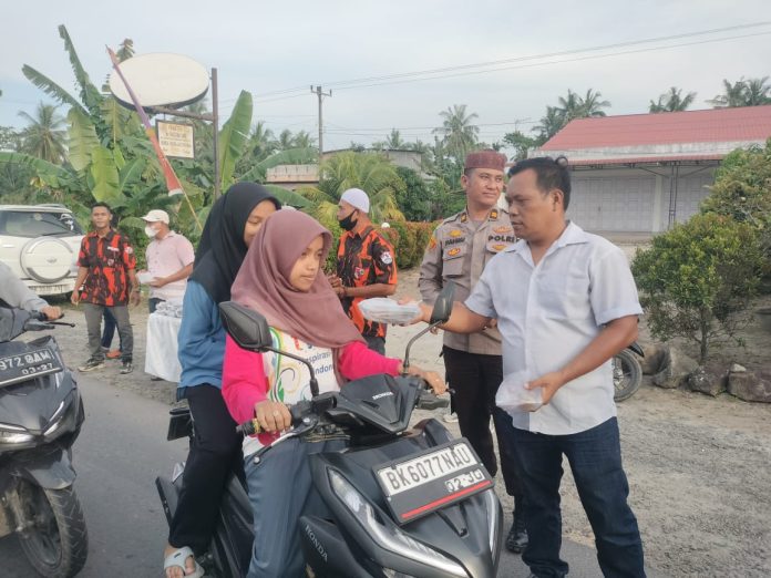 Organisasi Masyarakat Pemuda Pancasila (PP) PAC Kecamatan Medang Deras menggelar kegiatan sosial dengan membagikan takjil gratis kepada masyarakat yang melintas di Jalan Asses Road, Simpang Davit, Desa Lalang, Kecamatan Medang Deras, Kabupaten Batu Bara pada Selasa sore
