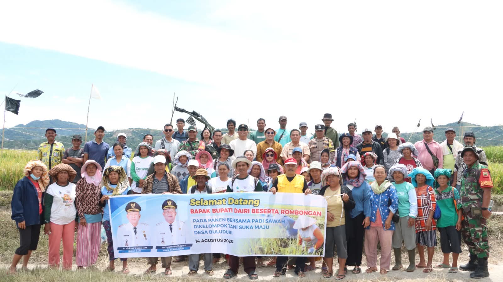 Dairi – Pancapena.com – Wakil Bupati Dairi, Wahyu Daniel Sagala, didampingi Kepala Dinas Pertanian Ketahanan Pangan dan Perikanan (DPKPP), Robot Simanullang melakukan Panen Raya Padi bersama Kelompok Tani (Poktan) Sukamaju, Daerah Irigasi (DI) Buluduri, Kamis, (14/08/2025) di Kecamatan Lae Parira, Kabupaten Dairi, Provinsi Sumatera Utara, Indonesia.