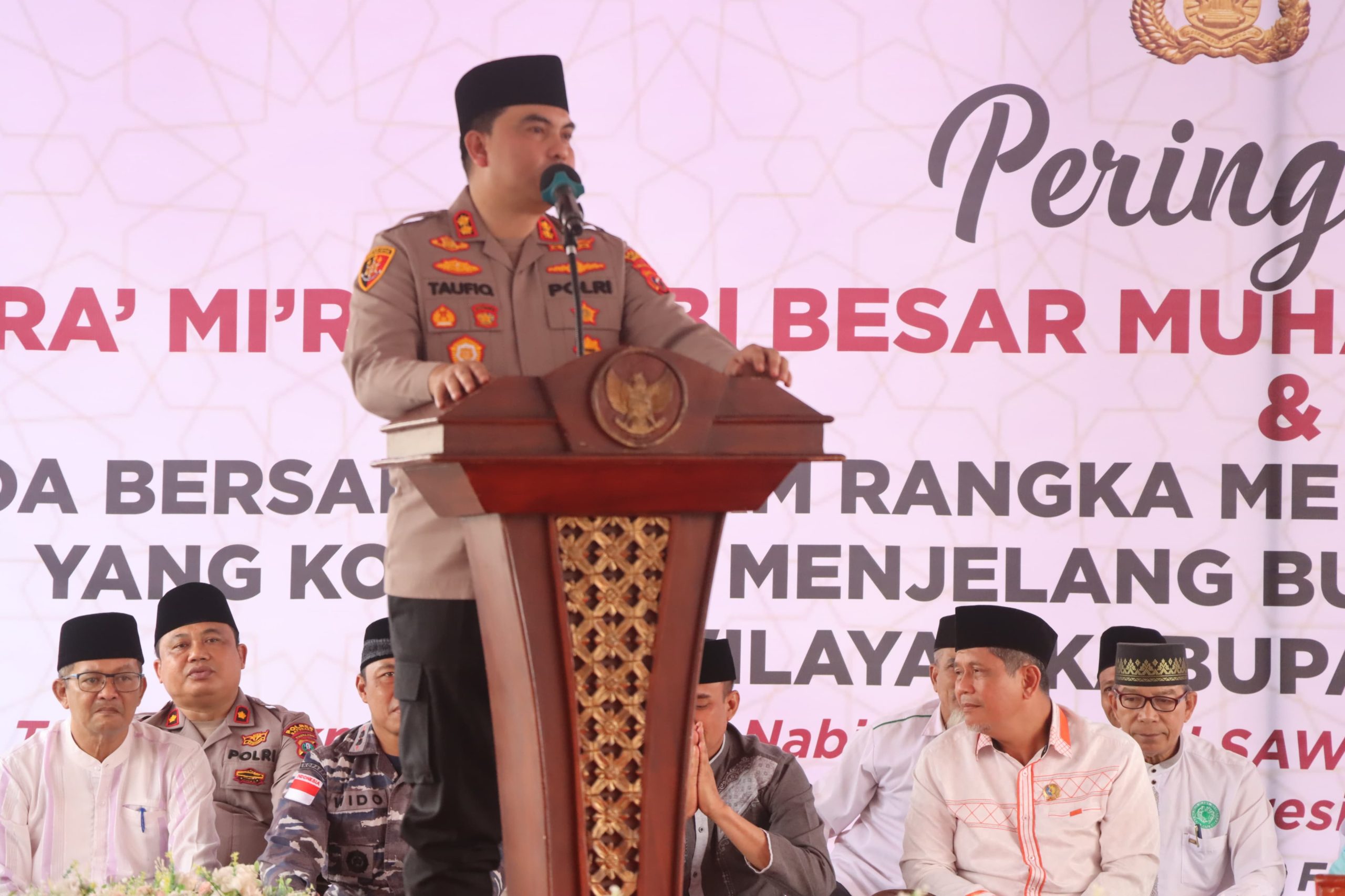 Dengan mengusung tema “Hikmah Isra’ Mi’raj Nabi Muhammad SAW, Kita Tingkatkan Kualitas Ibadah dan Kinerja Guna Menjadi Polri Presisi Indonesia Maju,” kegiatan ini dihadiri oleh berbagai pihak, termasuk unsur Forkopimda, tokoh agama, santri, serta masyarakat setempat. Acara diawali dengan pembacaan ayat suci Al-Qur’an oleh Alfin Qodri Hafiz, S.Sos., yang kemudian dilanjutkan dengan sambutan dari Kapolres Batu Bara, AKBP Taufiq Hidayat Thayeb, S.H., S.I.K., M.M. Dalam sambutannya, ia menegaskan pentingnya momen Isra’ Mi’raj sebagai inspirasi dalam meningkatkan kualitas ibadah dan profesionalisme dalam bertugas.