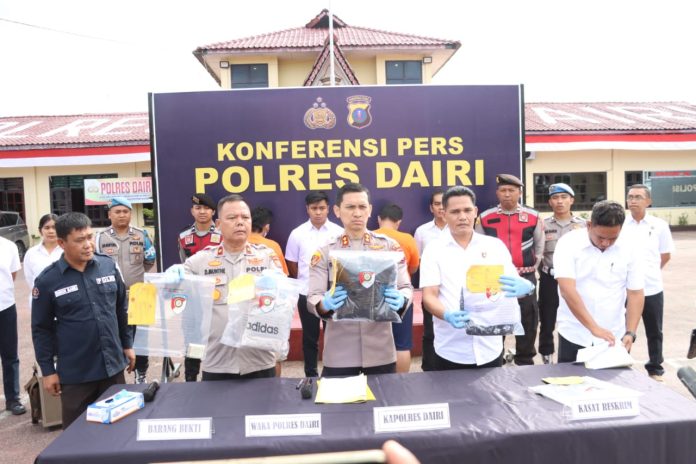Dalam Konferensi Pers di Halaman Mapolres Dairi, AKBP Otniel Siahaan, S.I.K., M.I.K Menerangkan Terdapat 2 Orang Tersangka dengan Kasus yang Berbeda, dengan masing-masing Tersangka Berinisial REN dan RK.