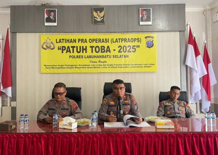 Labuhanbatu Selatan – Pancapena.com – Dalam rangka meningkatkan kesadaran dan disiplin masyarakat terhadap peraturan lalu lintas, serta menekan angka pelanggaran dan fatalitas kecelakaan di jalan raya, Polres Labuhanbatu Selatan menggelar Latihan Pra Operasi (Latpraops) “Patuh Toba 2025” di Aula Polres Labuhanbatu Selatan, Sabtu (12 Juli 2025).
