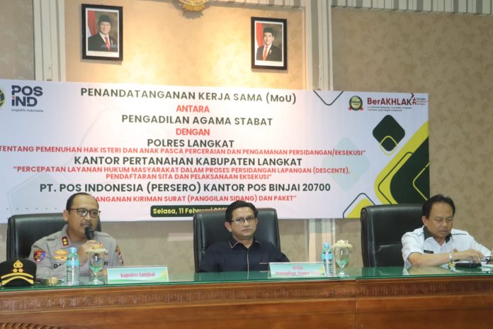 Kapolres Langkat, AKBP David Triyo Prasojo, SH, SIK, MSi, melaksanakan penandatanganan Memorandum of Understanding (MoU) dengan Pengadilan Agama Stabat pada hari Selasa, 11 Februari 2025, bertempat di Aula Pengadilan Agama Stabat. Adapun fokus dari MoU tersebut ialah Pemenuhan Hak Perempuan dan Anak Pasca Perceraian dan Pengamanan persidangan.
