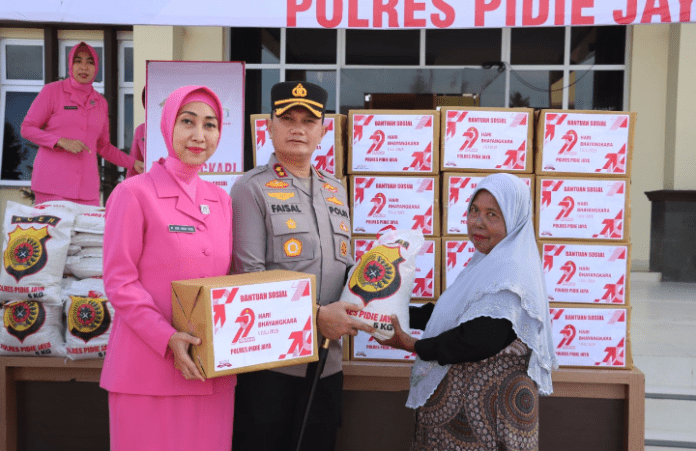 Polres Pidie Jaya, dipimpin langsung oleh Kapolres AKBP Ahmad Faisal Pasaribu, S.H., S.I.K., M.H., menyalurkan bantuan sosial (bansos) berupa beras, minyak goreng, teh celup, dan gula pasir.