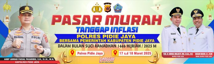 Pidie Jaya – Pancapena.com – Dalam upaya membantu masyarakat mendapatkan kebutuhan pokok dengan harga terjangkau, Polres Pidie Jaya bersama Pemerintah Kabupaten (Pemkab) Pidie Jaya akan menggelar Pasar Murah pada 17-18 Maret 2025. Acara ini akan berlangsung di halaman Polres Pidie Jaya mulai pukul 09.00 WIB hingga selesai.