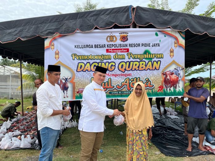 Pidie Jaya – Pancapena.com – Polres Pidie Jaya menyalurkan sebanyak 200 kantong daging qurban kepada warga kurang mampu di delapan kecamatan dalam wilayah hukumnya pada Jumat, 6 Juni 2025. Kegiatan ini merupakan bagian dari peringatan Hari Raya Idul Adha 1446 H dan dilaksanakan sebagai bentuk kepedulian sosial Polri kepada masyarakat.