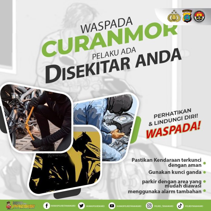 Tanah Karo – Pancapena.com – Dalam rangka menjaga situasi keamanan dan ketertiban masyarakat (kamtibmas), Polres Tanah Karo mengimbau seluruh warga untuk lebih waspada terhadap potensi tindak pencurian kendaraan bermotor (curanmor) yang dapat terjadi kapan saja dan di mana saja.