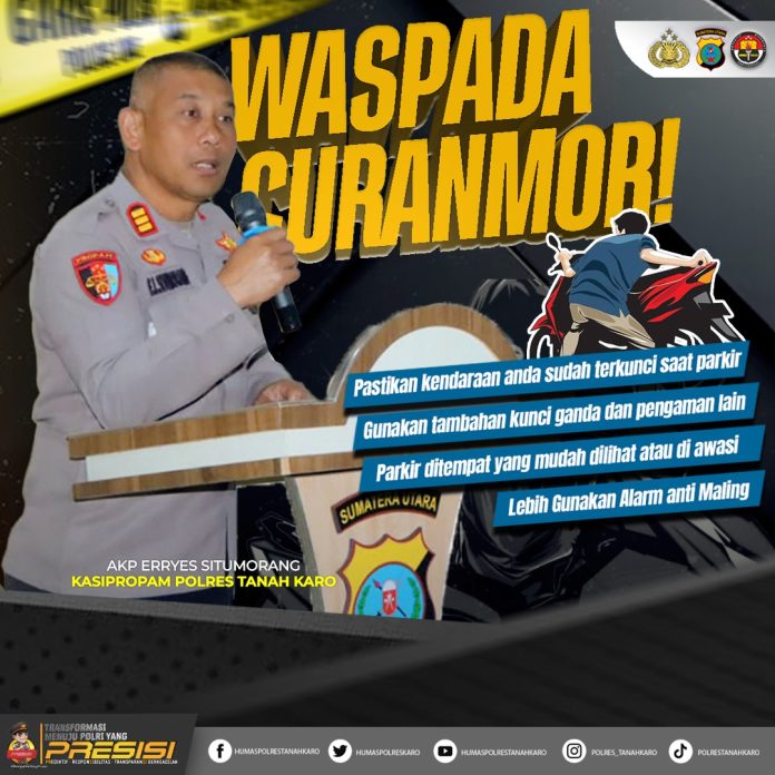 Tanah Karo – Pancapena.com – Kepolisian Resor (Polres) Tanah Karo mengimbau masyarakat untuk meningkatkan kewaspadaan terhadap maraknya aksi pencurian kendaraan bermotor (curanmor) di wilayah hukum setempat. Imbauan ini disampaikan sebagai bentuk pencegahan dan upaya menjaga keamanan serta ketertiban masyarakat (kamtibmas).