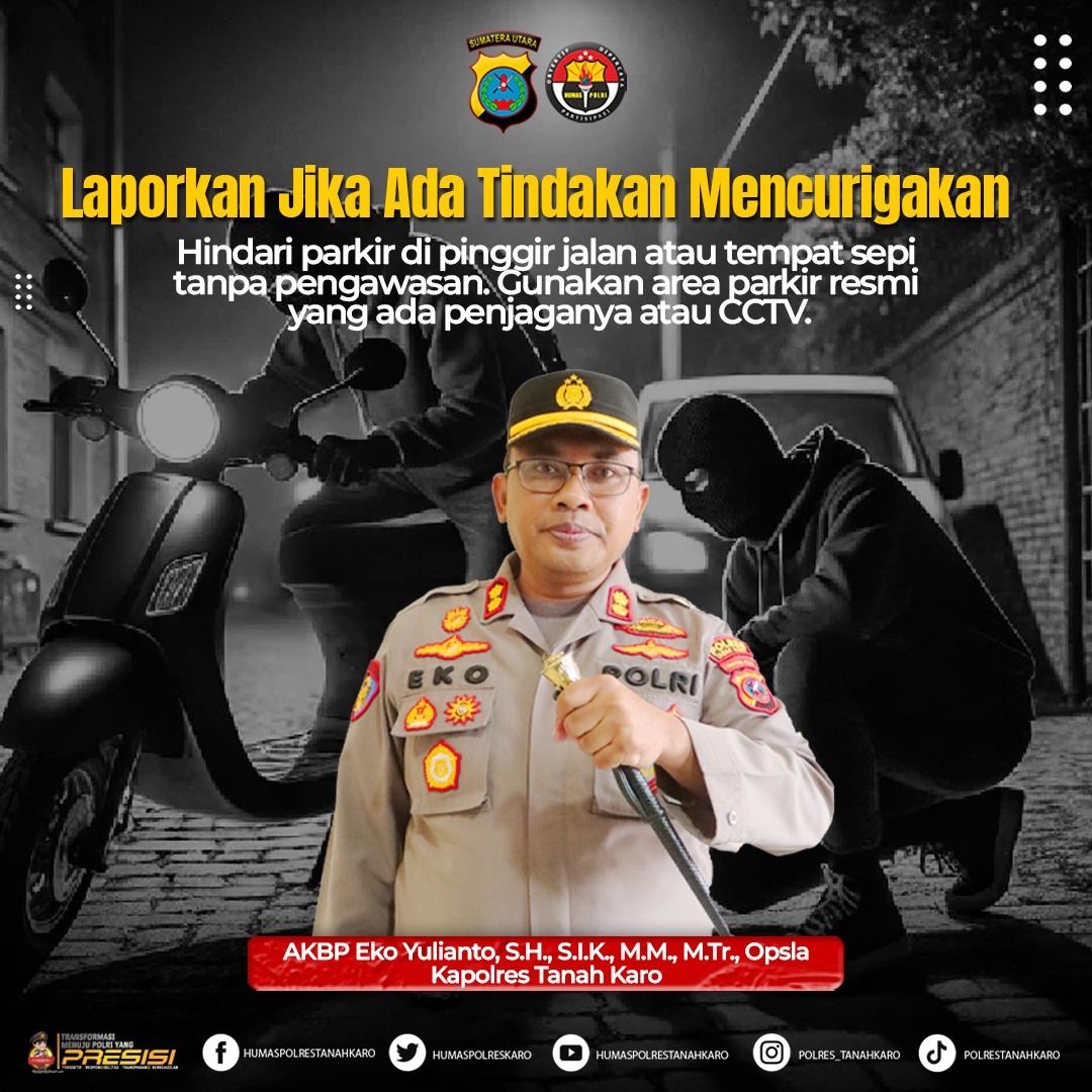 Tanah Karo – Pancapena.com – Polres Tanah Karo mengimbau masyarakat untuk meningkatkan kewaspadaan terhadap potensi tindak pidana pencurian kendaraan bermotor (curanmor) yang dapat terjadi di berbagai tempat, khususnya di lokasi yang minim pengawasan.