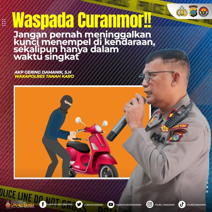 KARO – Pancapena.com – Polres Tanah Karo mengeluarkan imbauan kepada masyarakat untuk lebih waspada terhadap aksi pencurian kendaraan bermotor (curanmor) yang kerap terjadi dan meresahkan warga.