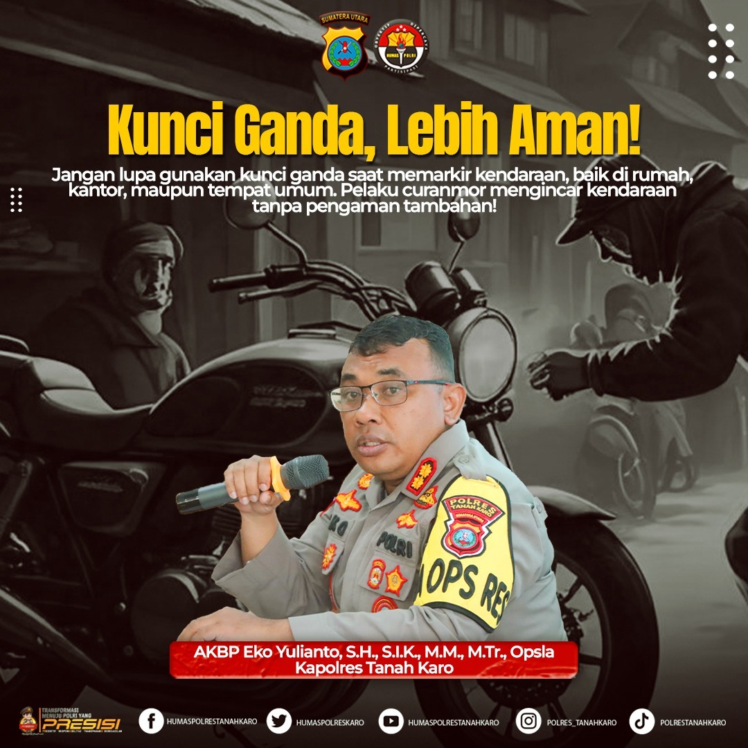 Tanah Karo – Pancapena.com – Guna mengantisipasi maraknya kasus pencurian kendaraan bermotor (curanmor), Polres Tanah Karo mengeluarkan imbauan kepada masyarakat agar lebih waspada dan proaktif menjaga keamanan kendaraan mereka.