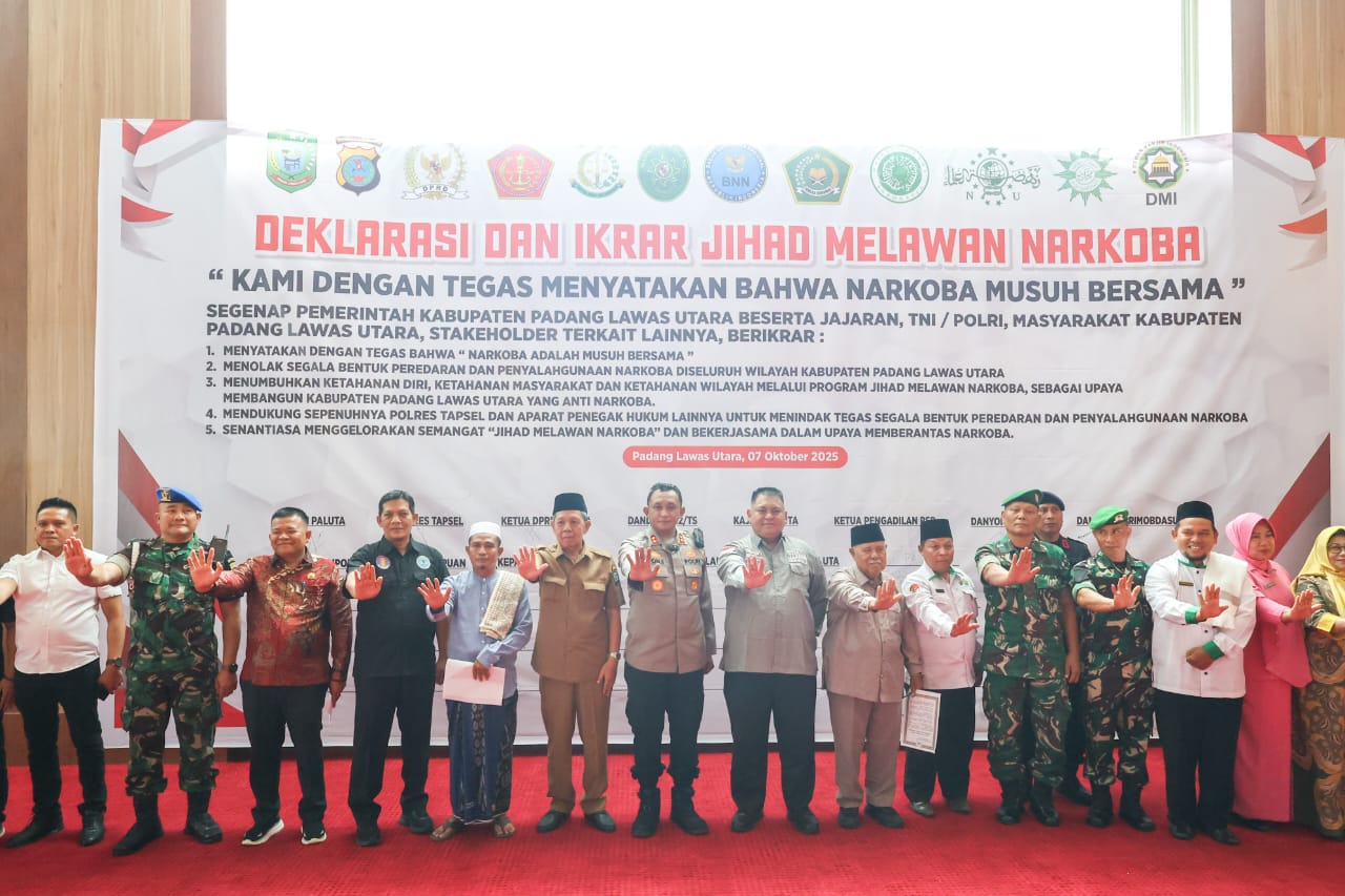 PADANG LAWAS UTARA – Pancapena.com – Dalam rangka memperkuat komitmen pemberantasan narkoba, Kepolisian Resor (Polres) Tapanuli Selatan bersama Forum Koordinasi Pimpinan Daerah (Forkopimda) Kabupaten Padang Lawas Utara (Paluta) menggelar kegiatan Deklarasi dan Operasi Penyakit Masyarakat (Pekat) Jihad Melawan Narkoba, Selasa (7/10/2025), bertempat di Ballroom Hotel Sapadia, Gunung Tua.