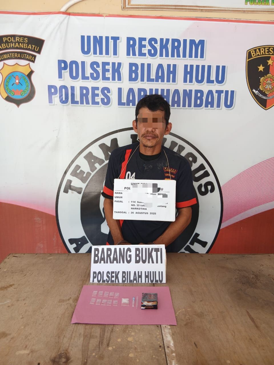 Labuhanbatu – Pancapena.com – Seorang pria berinisial S alias Moko (42), yang diketahui bekerja sebagai karyawan BUMN, diamankan pihak kepolisian dari Polsek Bilah Hulu, Polres Labuhanbatu, atas dugaan penyalahgunaan narkotika jenis sabu. Penangkapan dilakukan pada Selasa, 26 Agustus 2025, sekitar pukul 11.45 WIB, di kawasan perkebunan yang berada di wilayah Kecamatan Bilah Hulu, Kabupaten Labuhanbatu.