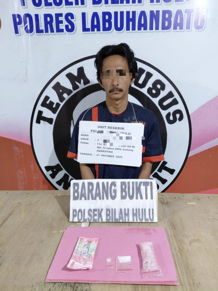 Labuhanbatu – Pancapena.com – Unit Reskrim Polsek Bilah Hulu berhasil mengamankan seorang pria berinisial MZ alias Reno (31) dalam kasus penyalahgunaan narkotika jenis sabu. Penangkapan dilakukan pada Selasa, 21 Oktober 2025, sekitar pukul 20.00 WIB di teras sebuah rumah di Dusun Perjuangan, Desa Pondok Batu, Kecamatan Bilah Hulu.