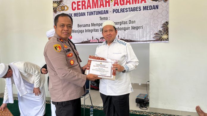 Medan | PancaPena.com – Dalam upaya memperkuat persatuan dan menciptakan keamanan yang berkelanjutan, Polsek Medan Tuntungan menggelar Ceramah Lintas Agama yang menggugah semangat kebersamaan lintas elemen masyarakat. Acara berlangsung khidmat di Musholla Al-Witri, Jalan Bunga Turi III, Kelurahan Laucih, Kecamatan Medan Tuntungan, pada Kamis (14/8/2025).