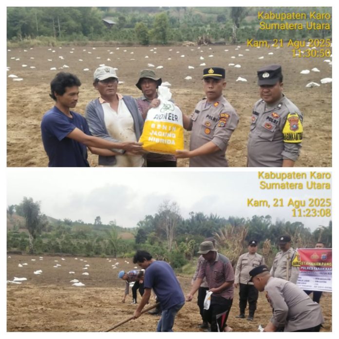 Merek, Karo – Pancapena.com – Polsek Tigapanah Polres Tanah Karo melaksanakan kegiatan penanaman jagung di lahan binaan Polres Tanah Karo sebagai wujud dukungan terhadap program ketahanan pangan nasional. Kegiatan ini digelar pada Kamis (21/8/2025) di Perladangan Juma Lepar, Desa Suka Mandi, Kecamatan Merek, Kabupaten Karo.