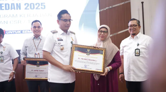 Panca pena com. PT Pelabuhan Indonesia (Persero) Regional 1 kembali menorehkan prestasi dengan menerima penghargaan Corporate Social Responsibility (CSR) Award dari Wali Kota Medan, Rico Tri Putra Bayu Waas, dalam ajang penghargaan CSR Kota Medan 2025 yang digelar di Kantor Walikota Medan, Rabu (11/6).