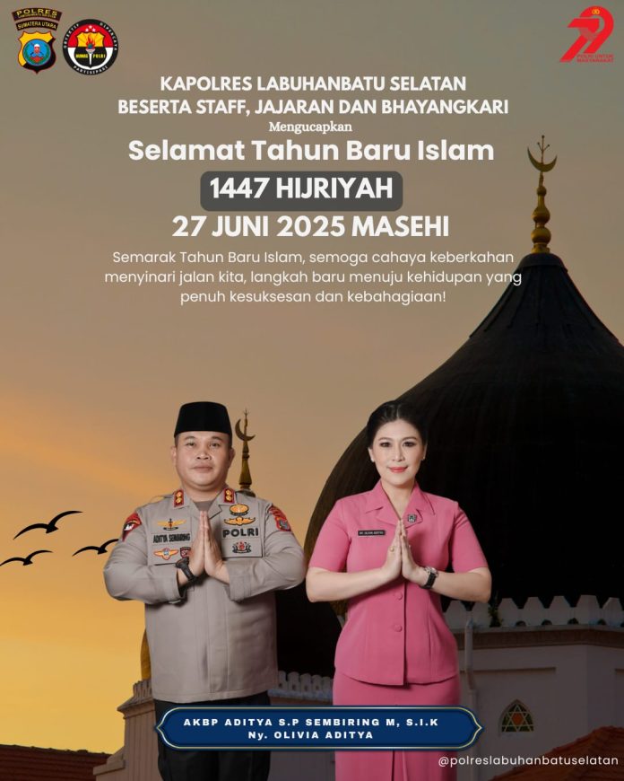 Labuhanbatu Selatan – Pancapena.com – Dalam semangat menyambut pergantian Tahun Baru Islam 1447 Hijriah yang jatuh pada Jumat, 27 Juni 2025 Masehi, Kapolres Labuhanbatu Selatan, AKBP Aditya S.P. Sembiring, S.I.K., bersama Ketua Bhayangkari Cabang Labuhanbatu Selatan, Ny. Olivia Aditya, beserta seluruh staf dan jajaran Polres menyampaikan ucapan selamat kepada seluruh umat Islam, khususnya masyarakat Kabupaten Labuhanbatu Selatan.