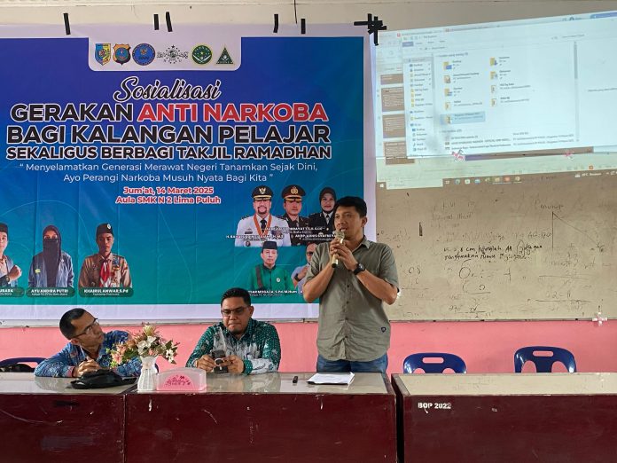 Pancapena.com – Lima Puluh// Dalam mengantisipasi peredaran barang haram seperti Narkotika dan lain sebagainya serta untuk lebih mengenal bentuk jenis – jenis Narkotika di kalangan pelajar, Polres Batu Bara melalui Sat Res Narkoba melaksanakan Sosialisasi Gerakan Anti Narkoba bagi Kalangan Pelajar di SMK N 2 Lima Puluh Kecamatan Lima Puluh Pesisir Kabupaten Batu Bara (14 Maret 2025 / pukul 16.00 wib )