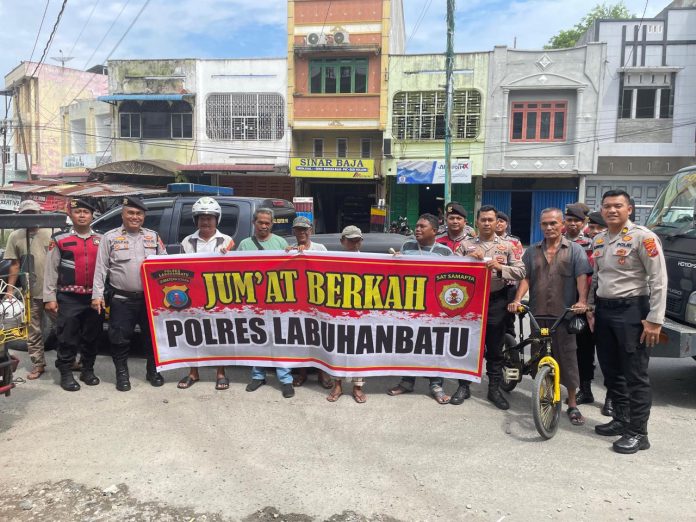 Labuhanbatu – Pancapena.com – Dalam rangka membangun kedekatan dan kepedulian terhadap masyarakat, Satuan Samapta Polres Labuhanbatu melaksanakan kegiatan sosial bertajuk Jumat Berkah dengan membagikan 50 bungkus nasi makan siang kepada pengemudi becak dan tukang parkir, Jumat (30/5/2025).