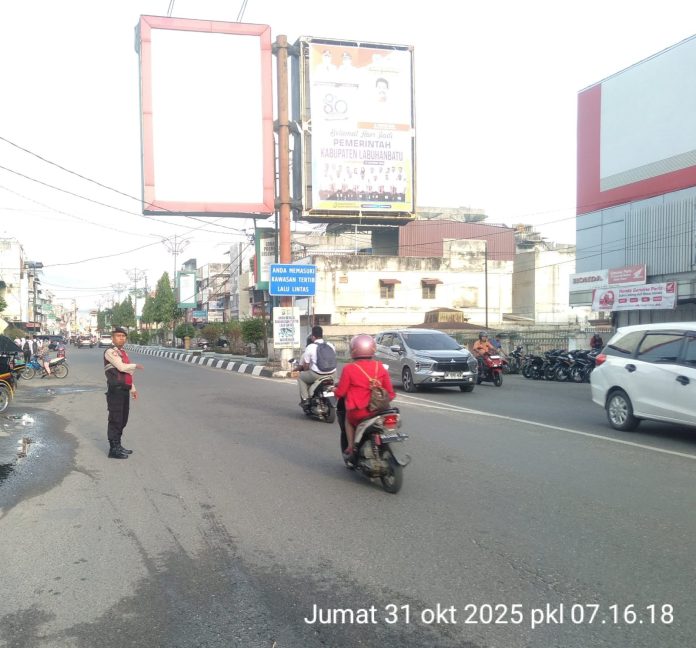 Labuhanbatu, 31 Oktober 2025 – Pancapena.com – Personel Satuan Samapta Polres Labuhanbatu melaksanakan kegiatan Strong Point atau penjagaan dan pengaturan lalu lintas (Pos Padat Pagi) di sejumlah titik strategis wilayah hukum Polres Labuhanbatu, Jumat (31/10/2025).