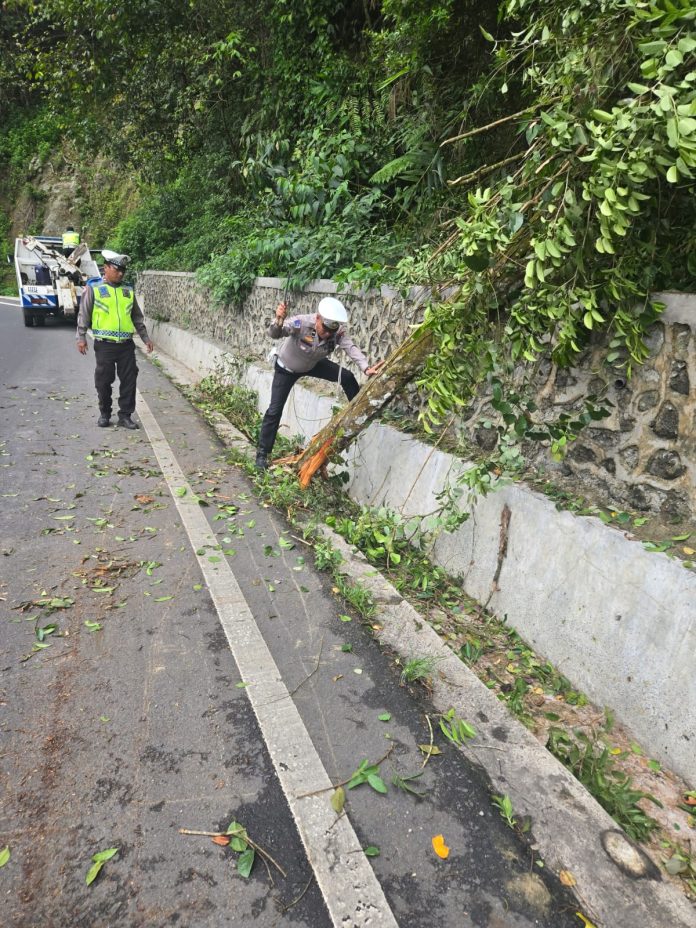 Berastagi, Karo – Pancapena.com – Personel Satuan Lalu Lintas (Satlantas) Polres Tanah Karo bergerak cepat mengevakuasi pohon tumbang yang menghalangi Jalan Medan–Kabanjahe KM 55–56, Desa Doulu, Kecamatan Berastagi, pada Jumat malam (26/9/2025) sekitar pukul 23.00 WIB. Kejadian tersebut sempat menyebabkan antrean panjang karena jalan hanya bisa dilalui secara bergantian.