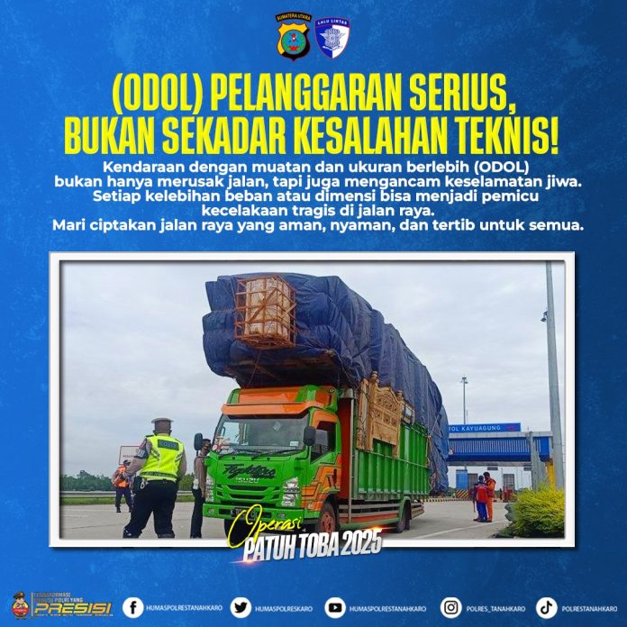 Karo — Pancapena.com – Dalam pelaksanaan Operasi Patuh Toba 2025, Satuan Lalu Lintas (Satlantas) Polres Tanah Karo kembali menegaskan pentingnya kepatuhan terhadap regulasi kendaraan, khususnya mengenai pelanggaran Over Dimension dan Over Loading (ODOL). Penindakan terhadap pelanggaran ini dinilai sangat krusial demi menciptakan kondisi lalu lintas yang aman, tertib, dan berkelanjutan.