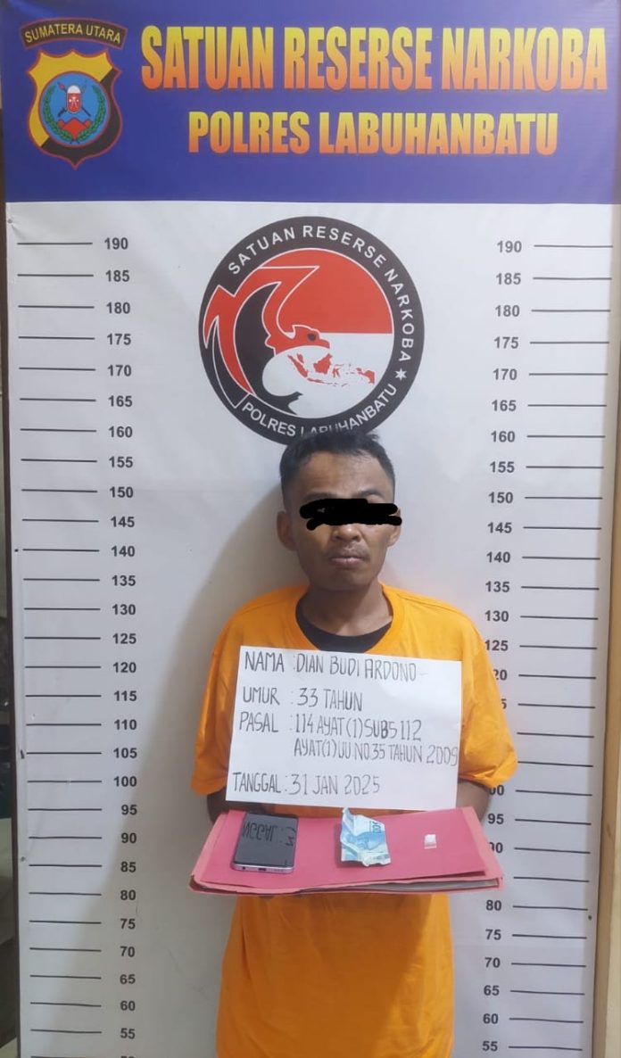 polreslabuhanbatu.Pancapena.com – LABUHANBATU Satuan Reserse Narkoba (Satres Narkoba) Polres Labuhanbatu kembali berhasil mengungkap kasus penyalahgunaan narkotika di wilayah hukumnya. Seorang pria berinisial DBA alias Papa Muda, yang merupakan residivis, diamankan petugas di Desa Sei Rakyat, Kecamatan Panai Tengah, Kabupaten Labuhanbatu, pada Jumat (31/1/2025).