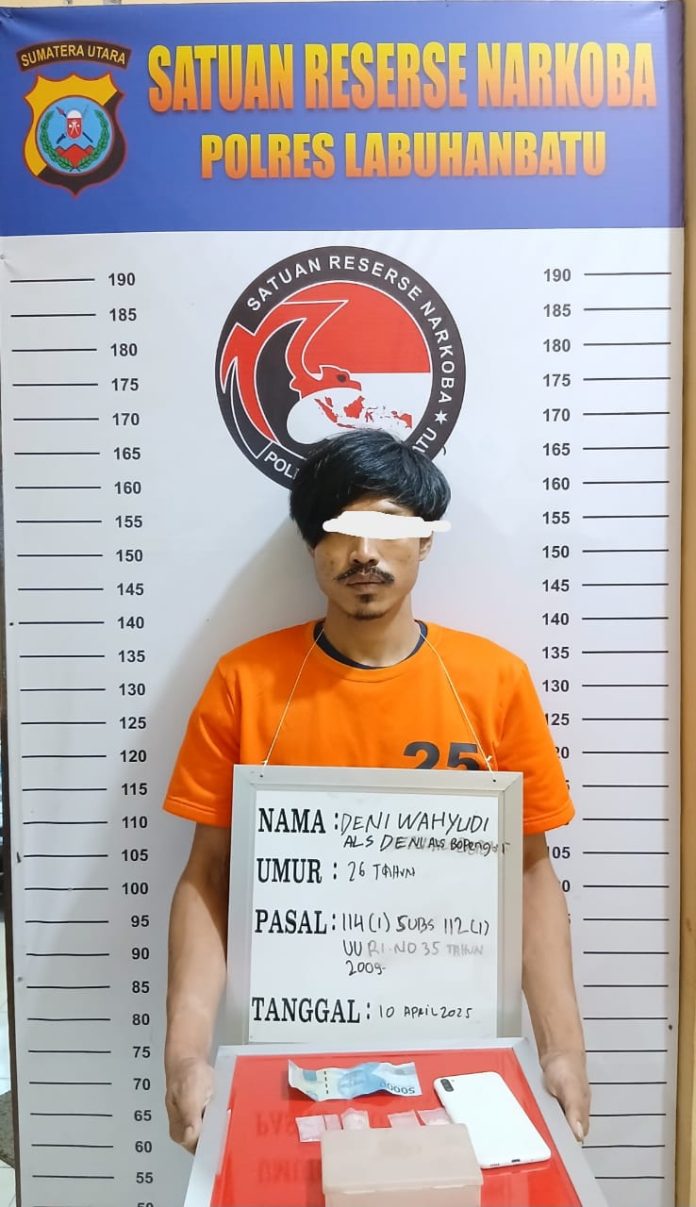 — Satresnarkoba Polres Labuhanbatu amankan DW alias Bopeng 26 tahun Terduga Pelaku Narkoba tepatnya di belakang rumahnya yang beralamat di Dusun Siluman A Desa Tebing Linggahara Kec. Bilah Barat Kab. Labuhanbatu, Kamis 10 April 2025.