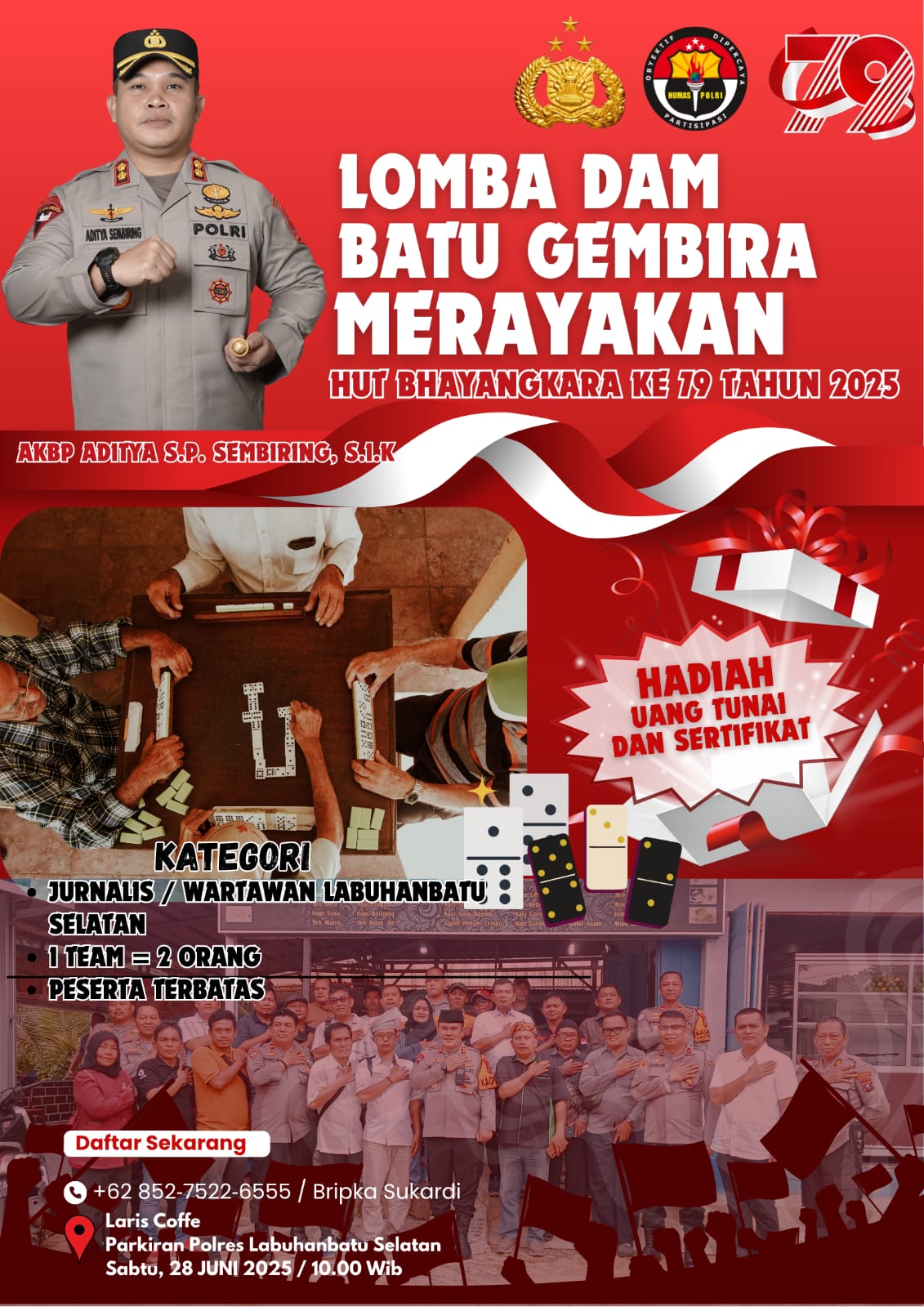 Labuhanbatu Selatan – Pancapena.com – Dalam rangka menyemarakkan peringatan Hari Bhayangkara ke-79 tahun 2025, Polres Labuhanbatu Selatan menggelar kegiatan unik dan penuh keakraban berupa Lomba Dam Batu Gembira, yang dikhususkan bagi para jurnalis dan wartawan yang bertugas di wilayah Kabupaten Labuhanbatu Selatan.