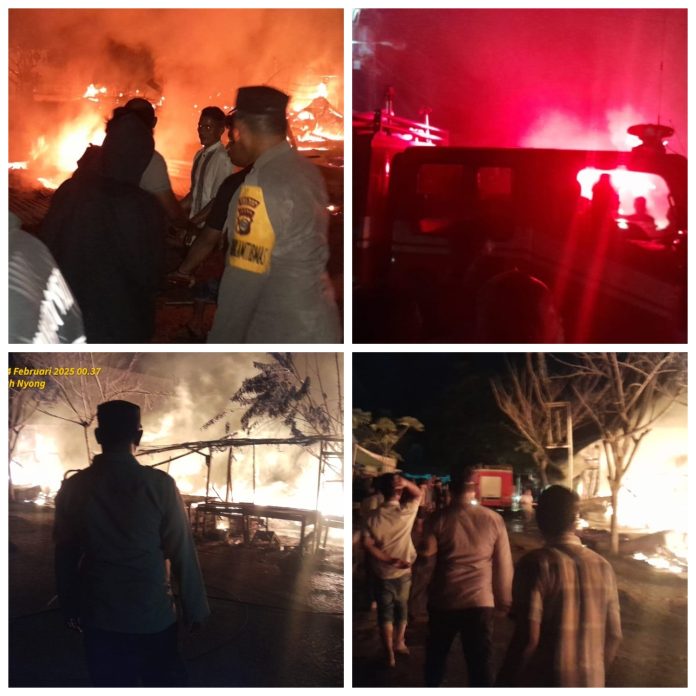 Pidie Jaya ,Pancapena.com– Kebakaran hebat melanda kawasan Pasar Sp.4 Nyong, Gampong Dayah Nyong, Kecamatan Bandar Baru, Kabupaten Pidie Jaya, pada Selasa (04/02/2025) dini hari. Api yang mulai berkobar sekitar pukul 00.10 WIB menghanguskan sepuluh ruko dan satu bangunan permanen, dengan total kerugian material diperkirakan mencapai Rp1 miliar.