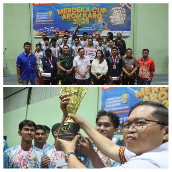 Berastagi, Karo – Pancapena.com – Tim bola voli asuhan Polres Tanah Karo berhasil menorehkan prestasi gemilang dengan meraih juara pertama pada final Turnamen Bilola Volley Piala Bupati Karo yang digelar di GOR Patriot Makodim 0205/TK, Kamis malam (21/8/2025) pukul 19.20 WIB.
