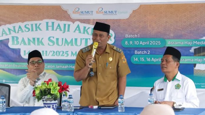 Dairi – Pancapena.com – Guna Mempersiapkan Calon Haji Secara Spiritual, Fisik, dan Psikologis, Wakil Bupati Dairi, Wahyu Daniel Sagala Memberangkatkan 12 Calon Jamaah Haji Eksklusif yang diadakan oleh PT Bank Sumut. Sebanyak 12 Calon Jamaah Haji yang terdiri dari 10 Orang Calon Berasal dari Kabupaten Dairi dan 2 Orang Berasal dari Kabupaten Pakpak Bharat.